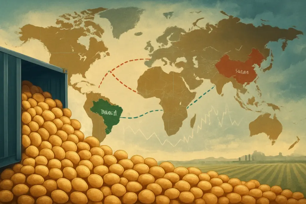 O Brasil figura entre os maiores exportadores de soja, milho, carne bovina, frango e açúcar. Contudo, a diversificação aparente esconde uma dependência acentuada de poucos destinos: China, União Europeia e alguns mercados do Oriente Médio.